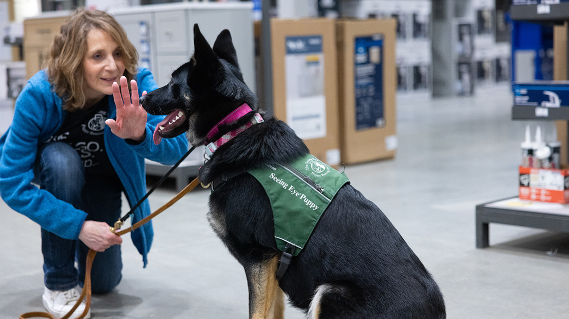 As a pet-friendly store, it’s not uncommon to see tails wagging up and down the aisles of Lowe’s as shoppers bring their furry family members in to run errands. One by one, German Shepard and Labrador puppies walk through the doors at the Butler, NJ Lowe’s on a weekday evening. Each dog wearing a vest or bandana that reads “The Seeing Eye.” The four-legged friends aren’t here to accompany their companions on a shopping trip; they’re here to train.