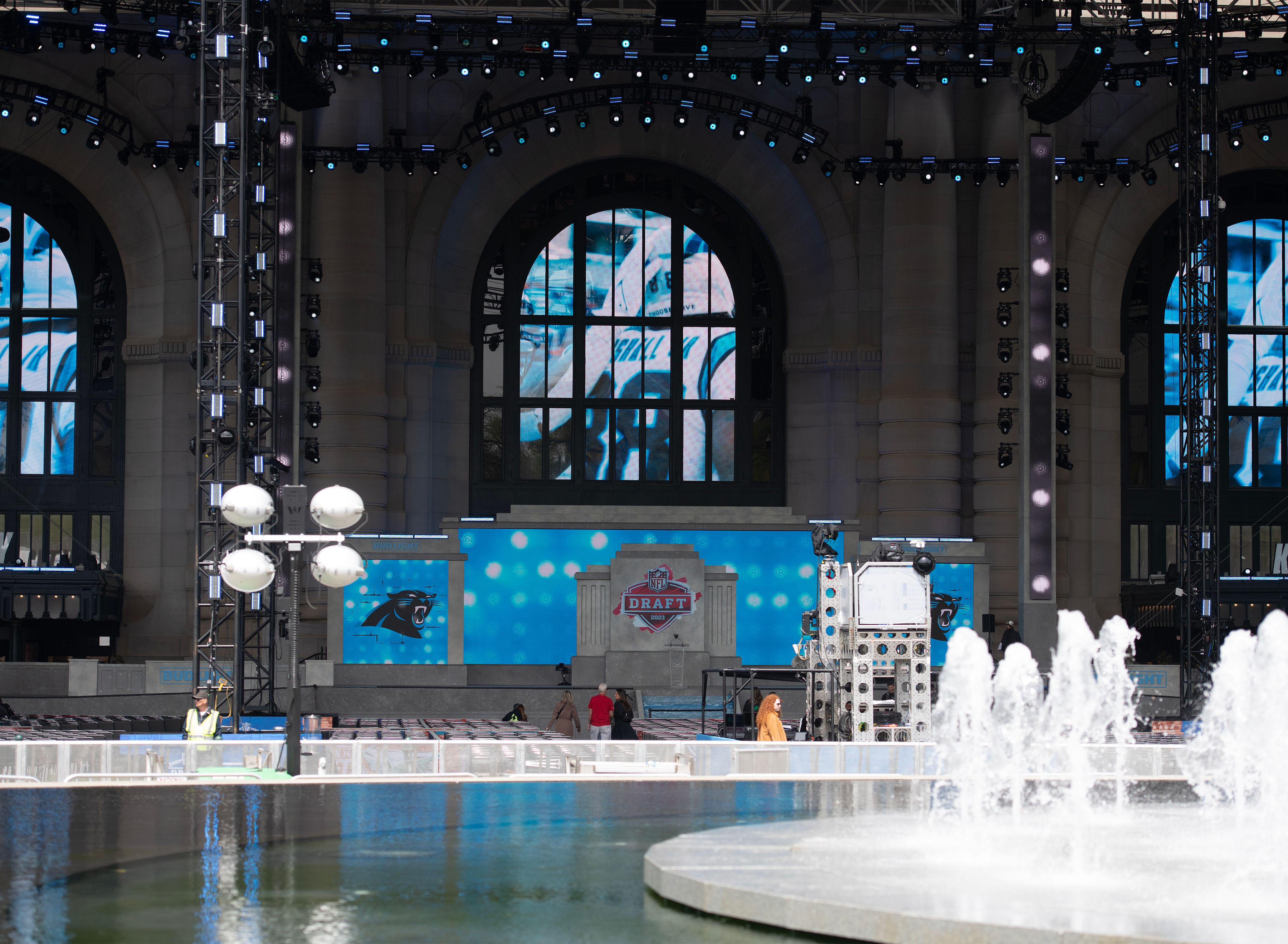 As in years past, Lowe’s has donated tools and safety equipment to help Pros build the NFL Draft Theater for the event. The equipment included over 200 hard hats, safety vests and glasses and Kobalt work gloves, over 100 Kobalt leather tool aprons, Valspar paint and three pallets of FLEX power tools and saws.