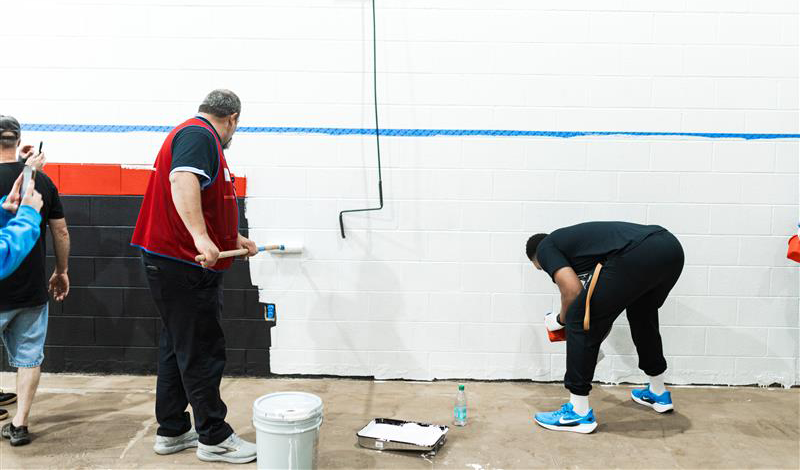 Hornets players Grant Williams and Josh Green joined Hornets helped paint the gym while volunteers rolled up their sleeves to help pack meals for area families in need. The Riverview Community Center serves as a hub for local residents, including a place to pick up extra groceries. The work served as a reminder that this effort is about care as much as construction.