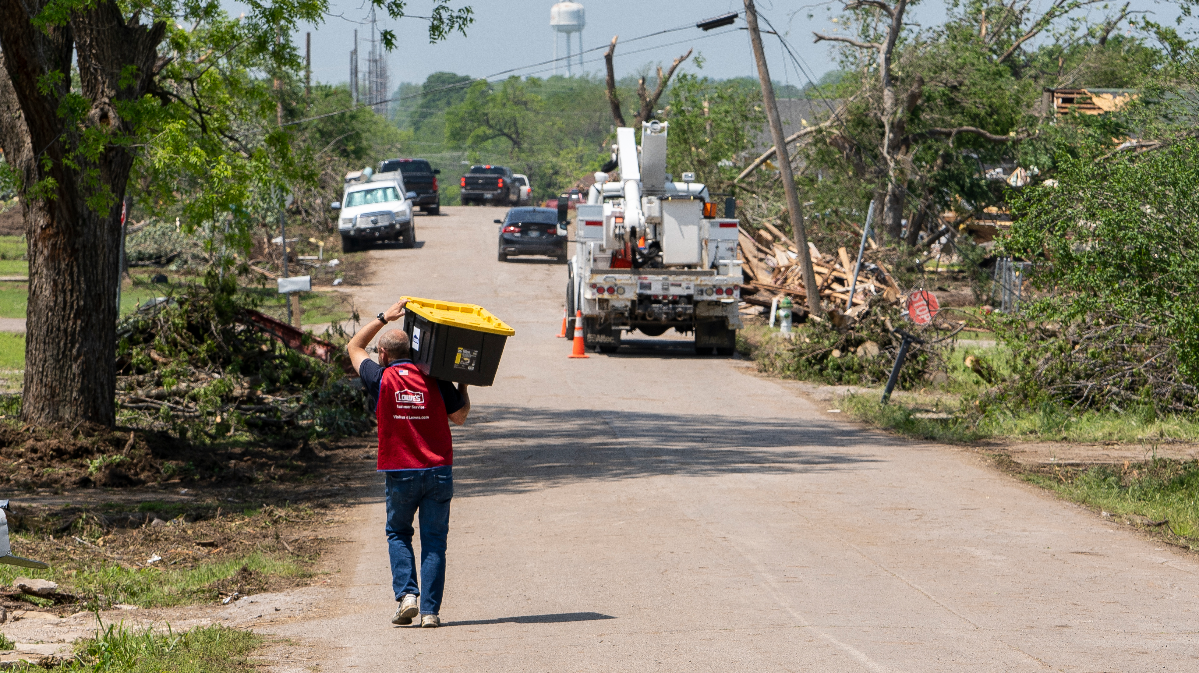 District Manager Jonathan Batten, along with David Villalobos, store manager, and multiple Lowe's associates, traveled door-to-door in the Sulphur, Oklahoma, area to deliver totes. Batten says it's essential to be there for the community in this critical time of repairing and rebuilding.