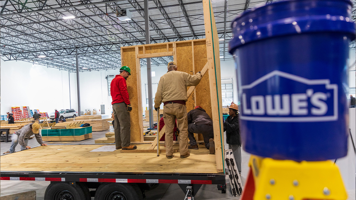 In addition to funding from Lowe’s and support from the Home Builders Association of Greater Charlotte, the Charlotte build is being supported by an enormous volunteer effort. Kelly donated his time and Lowe’s volunteers have been working alongside skilled volunteers from Habitat for Humanity, Advance Roofing and Exteriors and many more Home Builders Association member companies. In addition, industrial developer, SunCap Property Group donated the warehouse space in partnership with the Home Builders Association of Greater Charlotte to host the build. A portion of the tools were also supplied by the Charlotte Community ToolBank.